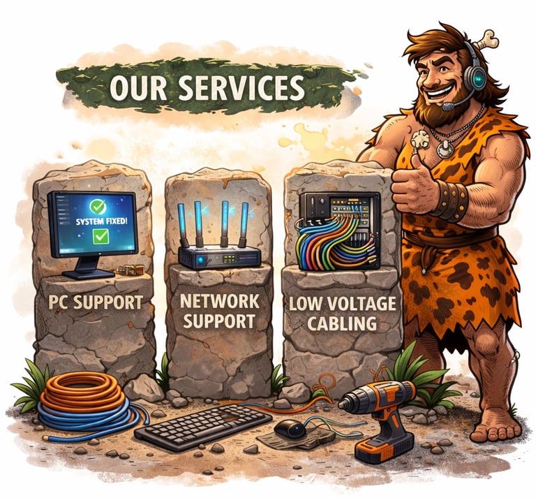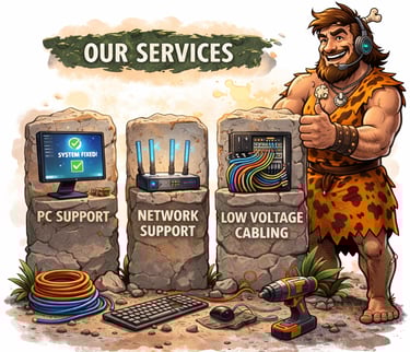 At Caveman Computers, we design and install professional low voltage cabling systems for homes and small businesses. Whether you’re setting up a new office, expanding your network, or cleaning up an outdated wiring mess, we make sure your infrastructure is clean, organized, and built to perform.